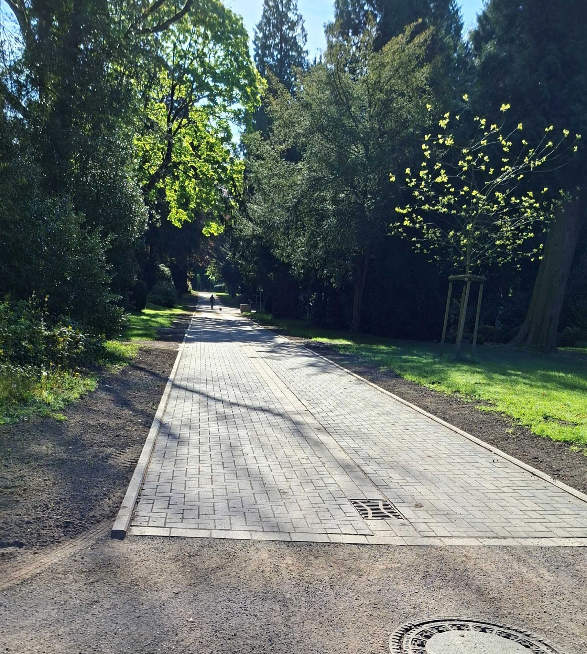 Passend zum Sonnenschein, den warmen Temperaturen und der strahlenden Sonne ist das Flanieren auf dem Parkfriedhof wieder uneingeschränkt möglich. Der lange 2. Hauptweg wurde umfangreich saniert. Die Kanalisation wurde erneuert, der Weg eingefasst und es wurde Betonsteinpflaster gelegt, sodass wir mitteilen können, dass von oben bis unten alles neu ist. Das letzte bisschen Rasen rechts und links vom Weg muss jetzt wieder frisch wachsen, wir hoffen aber, dass Sie schon jetzt viel Freude daran haben, die frühlingshaften Temperaturen auf dem Friedhof zu genießen.